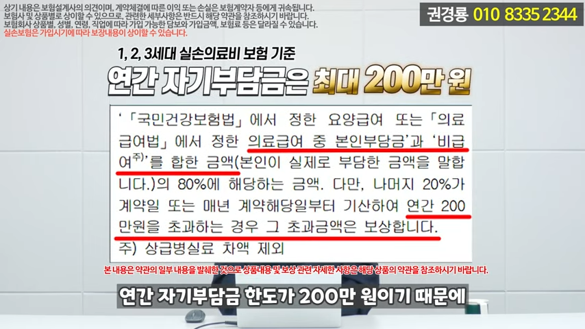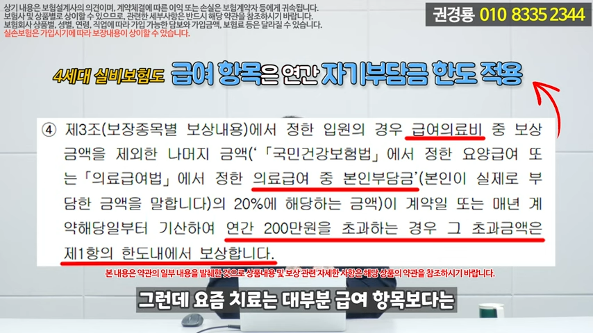 그러나 현재 4세대 실손보험의 비급여 항목에 대해서는 연간 자기부담금 200만 원 한도에 대해서 적용되지 않기 때문에 치료비가 33천만 원이 나왔을 경우에는 현행 30% 적용으로 900만 원이 나오게 됩니다.